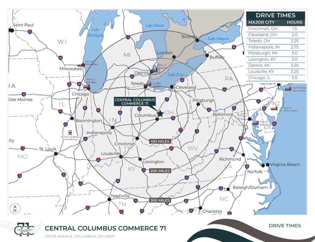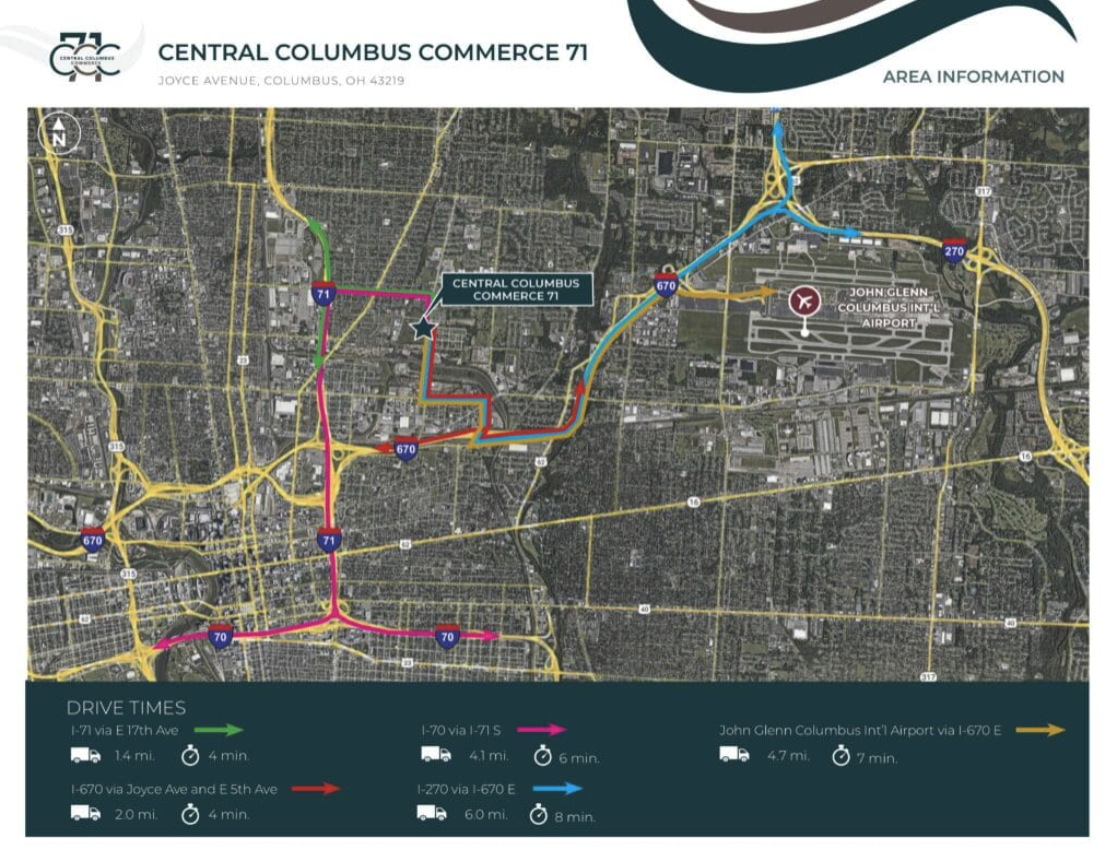 項目位於主要交通幹道I-670、I-70和I-71附近,有助於貨物運輸方便快捷。從項目位置出發,前往哥倫布市中心不到10分鐘。